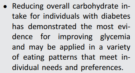 - O relatório concluiu que uma dieta baixa em carboidratos é uma opção de tratamento valiosa, que deve ser oferecida a pessoas com diabetes tipo 2, devendo ser considerada para mulheres com diabetes gestacional. Os pacientes devem ter a oportunidade de evitar medicação pelo resta da vida e a piora progressiva de sua doença, mesmo se o profissional de saúde achar que o paciente não conseguirá aderir à dieta.